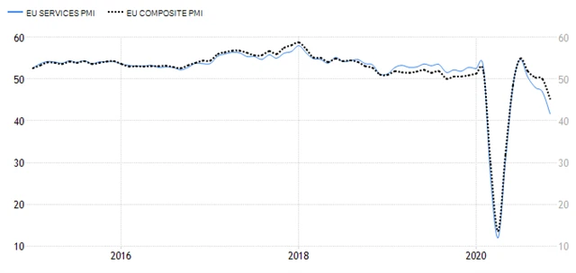 Index podnikatelské aktivity, který měří pouze dominantní sektor služeb, minulý měsíc klesl na 41,7 bodu ze 46,9 bodu. Už třetí měsíc po sobě se tak pohyboval pod 50 body a byl nejníže od května, kdy se Evropou šířila první vlna koronaviru. Sektor reagoval na pokles poptávky způsobený uzavřenými pohostinskými zařízeními, obchody a na výzvy vlád občanům, aby zůstávali doma.