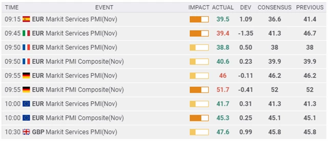 Evropa - PMI za služby a kompozitní ve vybraných zemích (listopad 2020), zdroj: fxstreet.com
