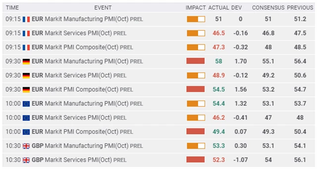 Zveřejněny byly i předběžné indexy nákupních manažerů pro Německo, Francii a Spojené království. Francouzský kompozitní PMI se snížil na 47,3 bodu z 48,5 bodu (odhad: 48 bodů) a německý souhrnný ukazatel klesl na 54,5 bodu z 54,7 bodu (odhad: 53,2 bodu).