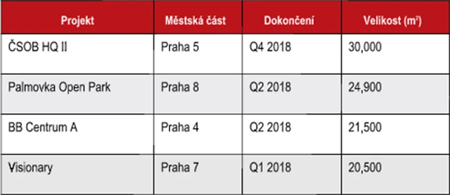 Ve čtvrtém čtvrtletí roku 2017 bylo v Praze dokončeno pět nových kancelářských budov – Palác Špork v Praze 1, Main Point Pankrác a Pankrác Prime Office Building v Praze 4, Aspira Business Centre v Praze 5 a AFI Karlín v Praze 8. Celkový počet moderních kancelářských prostor v hlavním městě Praze v minulém roce vzrostl na 3 342 000 metrů čtverečních.