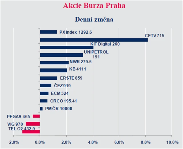 Hvězdou dnešní seance bylo CETV, které poskočilo o 8 % a hravě překonalo hladinu 715 Kč.