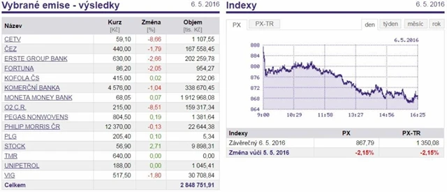 Pražská burza se v pátek po čtvrteční stagnaci vrátila k poklesu, index PX se propadl o 2,15 % na 867,79 bodu. Zlevnily akcie zavedených bank i energetické společnosti ČEZ, cenné papíry telekomunikační firmy O2 ztratily více než 8,5 %. Akcie burzovního nováčka MONETA Money Bank naopak vzrostly o 0,07 % a pražská burza díky nim zaznamenala největší letošní objem obchodů.