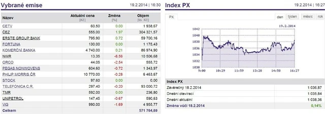 Index PX se pohyboval mírně pod nulou v závěru však vyskočil nahoru a zakončil den ziskem 0,14 % na 1 038,36 bodu.