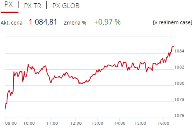 Pražská burza zahájila nový týden v zelených číslech, když index PX zpevnil o 0,97 % na 1 084,81 bodu. Nahoru burzu táhly zejména akcie Erste Group Bank, proti trendu šla telekomunikační společnost O2 Czech Republic. Objem obchodů byl s necelými 447 miliony korun podprůměrný.