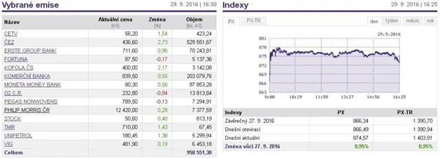 Index pražské burzy PX během čtvrtečního obchodování stoupl o 0,95 % na 874,57 bodu, když tahouny byly akcie ČEZ, jež také byly nejobchodovanějším titulem, a Kofola. Nejvýraznější ztrátu naopak zaznamenal operátor O2 Czech Republic.