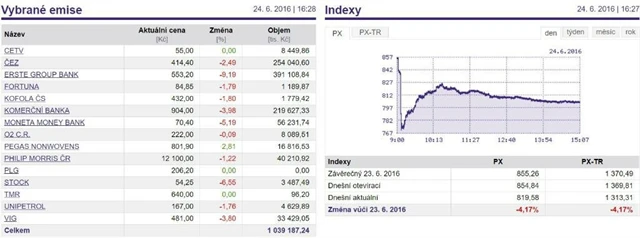 Pražská burza v pátek prudce klesala, v průběhu dne ale zvládla zkorigovat ranní až 10% propad. Spolu s dalšími trhy Praha reagovala na čtvrteční referendum, ve kterém Britové rozhodli o vystoupení své země z Evropské unie. Index PX nakonec v pátek spadl o 4,17 % na 819,58 bodu.