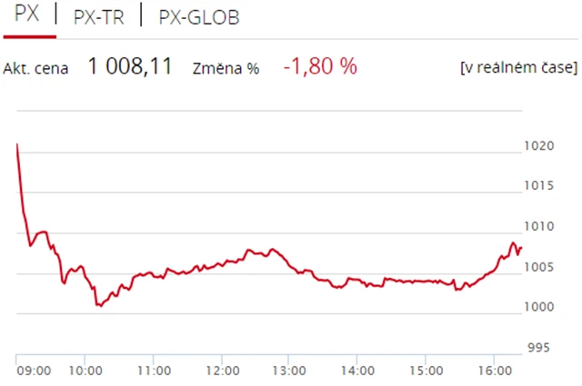 Pražská burza ve středu potřetí v řadě uzavřela v negativním pásmu, index PX klesl o 1,8 % na 1 008,11 bodu a dostal se nejníže za téměř rok a půl. Nedařilo se zejména akciím Erste Group Bank, které dolů zamířily poté, co rumunské ministerstvo financí představilo plány na zdanění bankovních aktiv. Proti trendu šla pouze energetická skupina ČEZ. Objem obchodů byl se 719 miliony korun nadprůměrný.