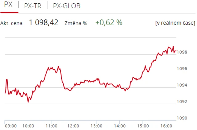 Pražská burza ve středu po dvou ztrátových seancích posílila, index PX stoupl o 0,62 % na 1 098,42 bodu. Jedná se o nejvyšší hodnotu od konce května. Nahoru burzu táhly zejména akcie Erste Group Bank a Komerční banky, nedařilo se naopak energetické skupině ČEZ. Objem obchodů byl s 547 miliony korun průměrný. (19. 9. 2018)