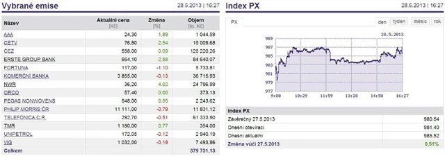 Pražská burza v úterý dále rozšiřovala zisky. Index PX připsal 0,51 %. Nahoru ho táhly především cenné papíry NWR (+4,02 %) a Erste Group Bank (+2,58 ), dařilo se i CETV (+2,54 %).
