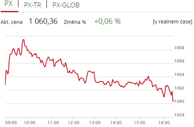 Pražská burza zakončila úterní obchodování téměř beze změny, index PX zpevnil o 0,06 % na 1 060,36 bodu. Nahoru ji táhly zejména akcie elektrárenské společnosti ČEZ a Komerční banky, nedařilo se naopak Monetě Money Bank. Objem obchodů byl s 341 miliony korun podprůměrný.
