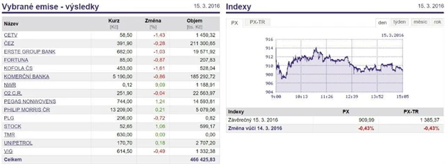 Akcie skupiny ČEZ v reakci na zveřejnění hospodářských výsledků ztrácely přes procento, v závěrečné aukci však část ztrát smazaly a nakonec uzavřely se ztrátou 0,28 %. Energetická skupina dosáhla za celý rok 2015 zisku EBITDA (provozní zisk před úroky, daněmi, odpisy a amortizací) 65,1 miliardy Kč. Skupina dříve nadvakrát snížila výhled zisku EBITDA na 64 miliard Kč z původních 70 miliard Kč. Zklamáním byl pro investory výhled firmy pro letošní rok.