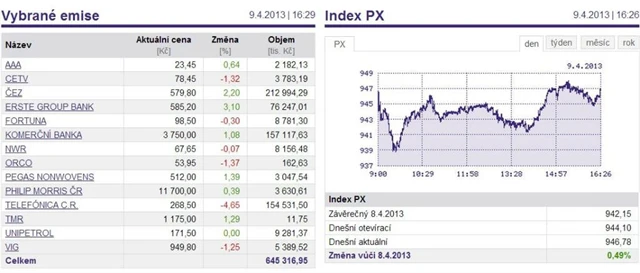 Pražská burza v úterý zvrátila předchozí propady - index PX posílil o 0,49 % a zakončil obchodování na 946,78 bodu.