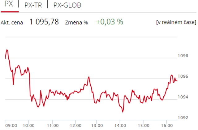 Pražská burza zakončila úterní obchodování na zelené nule, když index PX zpevnil o 0,03 % na 1 095,87 bodu. Dařilo se polostátní společnosti ČEZ, likérce Stock Spirits a antivirové firmě Avast, o více než procento naopak klesla Komerční banka. Objem obchodů byl s 510 miliony korun mírně podprůměrný.
