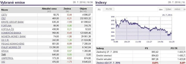 Index PX ve čtvrtek klesl o 0,69 % na 887,26 bodu. Akcie v Praze srážely stejně jako v západní Evropě především banky.