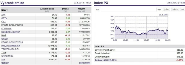 Pražská burza ve čtvrtek následovala propad na evropských trzích. Index PX odepsal 1,05 %