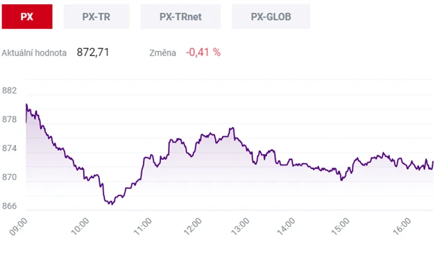 Pražská burza dnes přišla o část svých úterních zisků. Index PX klesl o 0,41 % na 872,71 bodu. Dolů ho táhly především bankovní tituly.