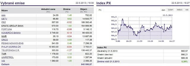 CME zaznamenala nejvýraznější růst ze všech hlavních emisí, o 8,62 % na 66,8 koruny. K celkovému posílení ovšem pražské burze pomohla hlavně Erste, jejíž akcie byly druhé nejobchodovanější. Cenné papíry bankovní skupiny zdražily o 1,82 % na 670 korun. "Za jejich růstem je úterní podvečerní růst na hlavním vídeňském trhu, který nebyl zohledněn v úterní závěrečné ceně v Praze," uvedl analytik Komerční banky Miroslav Adamkovič.