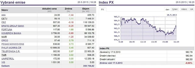 Pražská burza v pondělním obchodování kolísala, uzavřela však s téměř nulovou změnou - index PX odepsal 0,03 %.