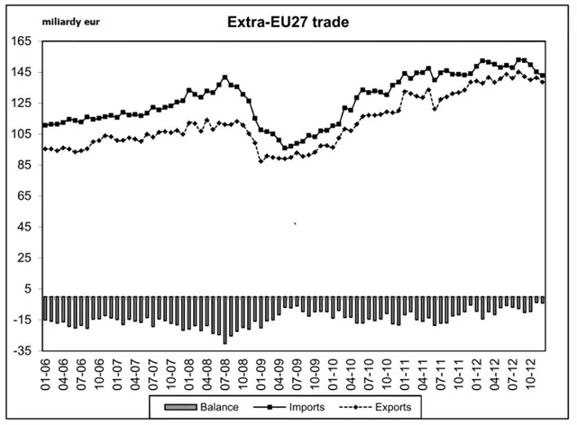 Za růstem přebytku není zlepšení stavu evropské ekonomiky, ale rychlejší propad dovozu v důsledku slabé domácí poptávky. Vývoz klesal pomaleji. Objem vývozu klesl o 3,1 % na 143,4 miliardy eur, zatímco dovoz spadl o 5,9 % na 131,7 miliardy eur. Přebytek zaostal za odhady analytiků, kteří v anketě agentury Reuters čekali růst na 13,1 miliardy eur.