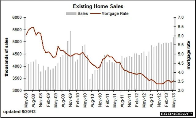 Prodeje existujících domů ve Spojených státech v květnu vzrostly o 4,2 % na celoroční tempo 5,18 milionu jednotek. Čekal se růst na 5 milionů jednotek. Meziročně prodeje vzrostly o 12,9 %.