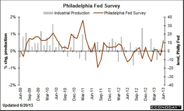Index průmyslové aktivity filadelfského Fedu v červnu nečekaně vyskočil na +12,5 bodu (květen: -5,2 bodu, odhad: -1 bod). Index nových zakázek vzrostl na 16,6 bodu z -7,9 bodu v předchozím měsíci, zaměstnanost poskočila na -5,4 bodu z -8,7 bodu a výhled na příštích šest měsíců se zlepšil z 32,3 bodu na 33,7 bodu.