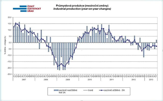 Průmyslová produkce v České republice v červenci meziměsíčně mírně vzrostla