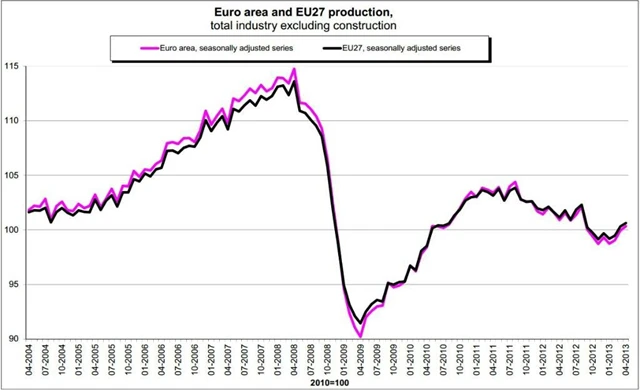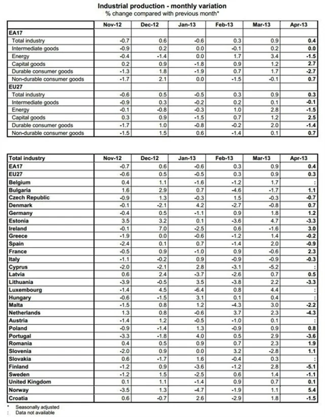 Průmyslová výroba v dubnu nečekaně vzrostla tažená především Francií, což by mohlo značit, že se eurozóna dostává z dlouhé recese. Produkce vzrostla o 0,4 % meziměsíčně, přestože se čekala stagnace. Březnové údaje byly zároveň revidovány mírně níže na +0,9 % z původních +1,0 %. Meziročně produkce v eurozóně klesla o 0,6 %, očekávalo se -1,2 %.