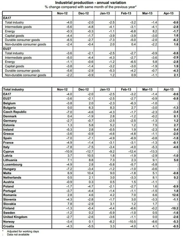 Oproti předchozímu roku si nejvíce polepšilo Rumunsko (+12,6 % z +6,6 % v dubnu 2012), propadlo se naopak Finsko (-10,2 % z -0,2 %). Česká republika dále prohloubila propad z -2,3 % loni v dubnu na -3,4 %.