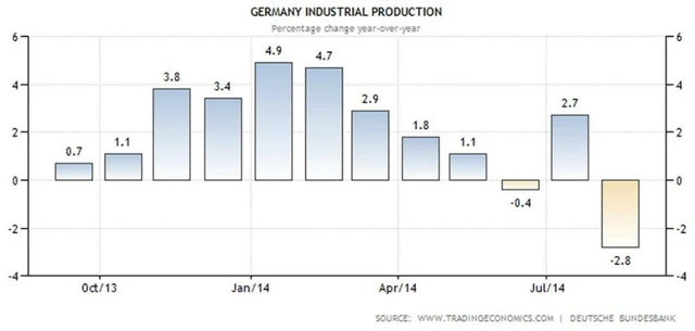 Průmyslová výroba v Německu klesla v srpnu proti předešlému měsíci o čtyři procenta, což byl výraznější pokles, než zněly i ty nejpesimističtější předpovědi. Byl to nejhlubší pokles výkonu německého průmyslu od počátku roku 2009, kdy vyspělý svět zažíval finanční a a ekonomickou krizi. Údaje spolkového ministerstva hospodářství jsou další známkou zhoršující se kondice největší evropské ekonomiky.