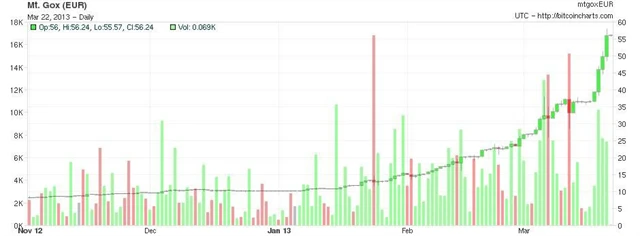 Vzestup kurzu Bitcoinu v posledních týdnech souvisí s obavami ohledně osudu kyperských bankovních vkladů. Podle internetových blogů hledá stále více měnových spekulantů alternativy. Na druhou stranu nedává příliš logiku, že by lidé, kteří jsou znechuceni zneužíváním papírových měn, hledali alternativy k euru, dolaru nebo britské libře v elektronické hotovosti. S větší pravděpodobností se vrátí k bezpečí "tvrdých" aktiv, jako jsou stříbro a zlato. Bohužel ani konfiskace reálných aktiv není v současném světě v případě urgentní potřeby zcela vyloučená.