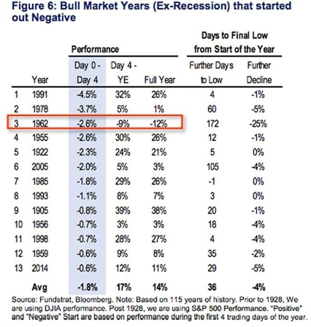 Začátek roku nebyl pro americké akcie nic moc. Podle Thomase Leeho z Fundstrat Global Advisors je to ale pro zachování býčího trendu jedině dobře. Svůj názor opírá o historii, ve které první dny v mínusu až na jednu výjimku znamenaly vždy celoroční zisk S&P 500.