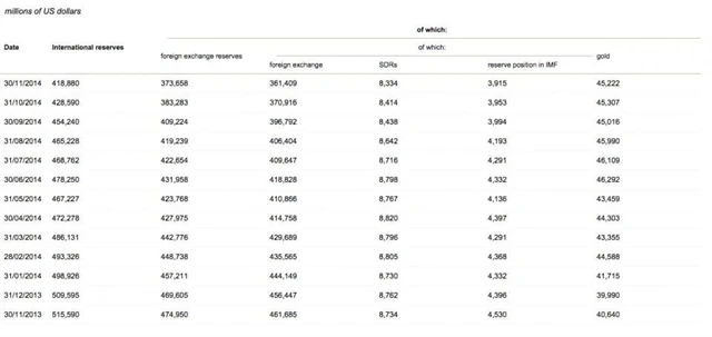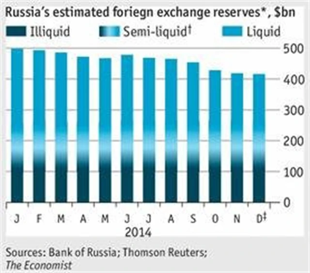 Podle listu The Economist tak Rusko na podporu domácí měny za posledních zhruba 12 měsíců nevynaložilo 100 miliard dolarů z 500, ale jen ze zhruba 300 miliard dolarů (likvidních rezerv). To lze interpretovat také tak, že mu na další zásahy na devizových trzích zbývá již jen posledních zhruba 200 miliard dolarů.