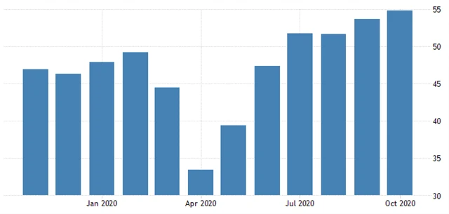Eurozóna - PMI v průmyslu (říjen 2020), zdroj: tradingeconomics.com