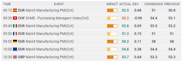 Index aktivity zpracovatelského průmyslu eurozóny v říjnu vzrostl na 54,8 bodu ze zářijových 53,7 bodu. Dostal se tak na nejvyšší úroveň od července 2018. Pokud se index nachází nad padesátibodovou hranicí, signalizuje růst aktivity, cokoliv pod 50 bodů znamená pokles.