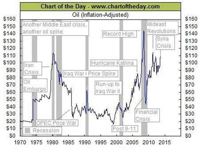 Na závěr se můžeme podívat na dlouhodobý vývoj ceny ropy. Jde o inflačně očištěný graf ceny ropy WTI, která podobně jako Brent v posledních dnech výrazně zdražila. Graf ukazuje, jak cena ropy od roku 1970 reaguje nebo souvisí s turbulencemi na Blízkém a Středním východě i americkými recesemi. Nepokoje v arabském světě vyhánějí ceny ropy výše, na což reagují ekonomiky zhoršením svých vyhlídek, protože rostou náklady v průmyslu, dopravě i na straně spotřebitelů.