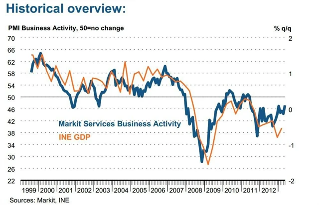 Španělský sektor služeb se v květnu vyšplhal na maximum za posledních 23 měsíců. Oproti dubnu si index nákupních manažerů polepšil na 47,3 bodu z 44,4 bodu, přestože se čekal růst pouze na 45 bodů. Stále se však nachází pod padesátibodovou hranicí, což znamená, že sektor služeb stále neexpanduje, pouze zpomalil propad.