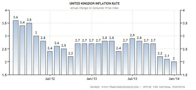 Tempo inflace ve Spojeném království v prosinci meziročně zpomalilo na 2 % z listopadových 2,1 %, ačkoliv se očekávala stagnace na 2,1 %. Meziměsíčně ceny ve Spojeném království vzrostly o 0,4 %, trh počítal s 0,5% růstem. Jádrová inflace rovněž zpomalila - na 1,7 % z listopadových 1,8 % -, ačkoliv se čekala stagnace. Inflace se tak poprvé od listopadu 2009 setkala s cílem Bank of England.