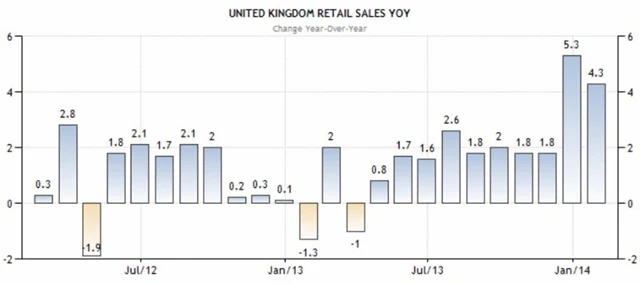 Maloobchodní tržby ve Spojeném království v lednu vzrostly meziročně o 4,3 % po +5,3 % v prosinci. Za leden se čekal meziroční růst o 5 %. Meziměsíčně v lednu tržby maloobchodníků naopak o 1,5 % klesly (odhad: -1 %, prosinec revidován na +2,5 % z +2,6 %), a zaznamenaly tak největší meziměsíční pokles od dubna 2012. Bez zahrnutí aut meziročně vzrostly o 4,8 % (odhad: +5,0 %) po růstu o 6,1 % v prosinci.