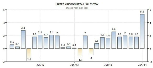 Maloobchodní tržby ve Spojeném království v prosinci vzrostly meziměsíčně o 2,8 %, ačkoliv se čekal jen 0,3% růst. Oproti prosinci 2012 vzrostly bez zahrnutí aut dokonce o 6,1 % proti očekávání 3,2 % po listopadových 2,1 % (revidováno z 2,3 %), což představuje nejprudší růst od ledna 2000. Celkové tržby i se započtením prodeje aut vzrostly meziměsíčně o 2,6 % (meziročně +5,3 %), což znamená nejsilnější prosinec od začátku sledování statistik v roce 1996.