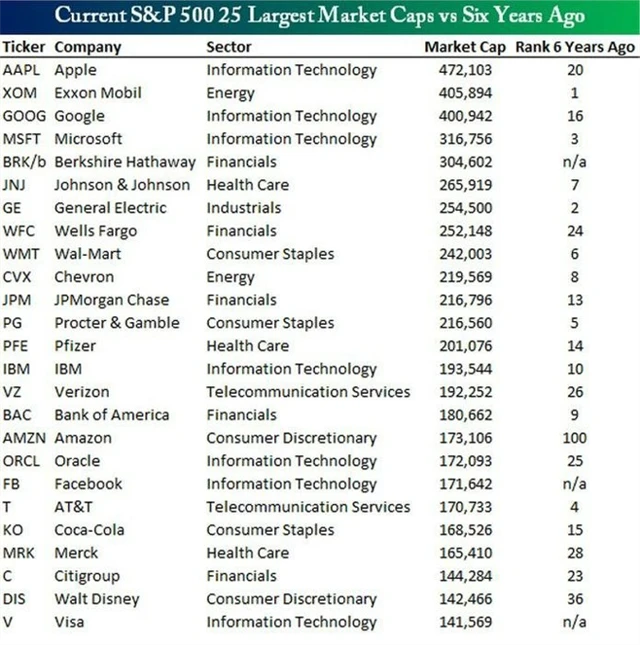 Za posledních šest let se pořadí v první pětadvacítce největších firem indexu S&P 500 podle tržní kapitalizace výrazně proměnilo. Nejenže přední příčky obsadily společnosti, které se ještě před šesti lety mohly sotva řadit do top 20, ale přibylo i několik nových hráčů, například Berkshire Hathaway Warrena Buffetta.