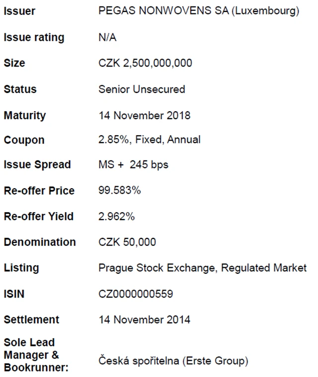 Znojemský výrobce netkaných textilií Pegas Nonwovens ukončil v listopadu emisi dluhopisů za 2,5 miliardy korun s pevným ročním úrokovým výnosem 2,85 %. Emisní kurz je 99,583 %, dluhopisy jsou splatné ke 14. listopadu 2018