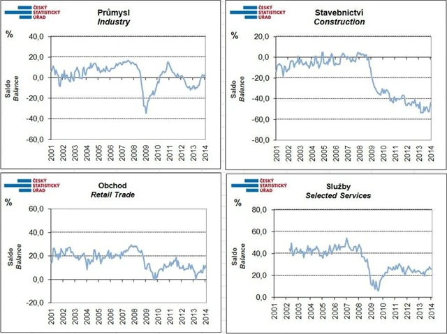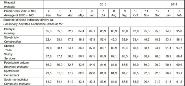 Celková důvěra v domácí ekonomiku se v únoru znovu nezměnila. Souhrnný indikátor důvěry (indikátor ekonomického sentimentu) zůstal ve srovnání s lednem na stejné hodnotě. Indikátor důvěry podnikatelů se celkově meziměsíčně zvýšil. V průmyslu, ve stavebnictví a v obchodě se důvěra zvýšila; ve vybraných odvětvích služeb se mírně snížila. Důvěra spotřebitelů se meziměsíčně snížila. Ve srovnání s hodnotami v únoru 2013 jsou souhrnný indikátor důvěry, indikátor důvěry podnikatelů a indikátor důvěry spotřebitelů vyšší.