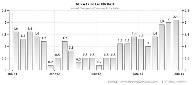 Spotřebitelské ceny v Norsku v červnu meziměsíčně klesly o 0,4 %, meziročně vzrostly o 2,1 %. Norská koruna oslabuje