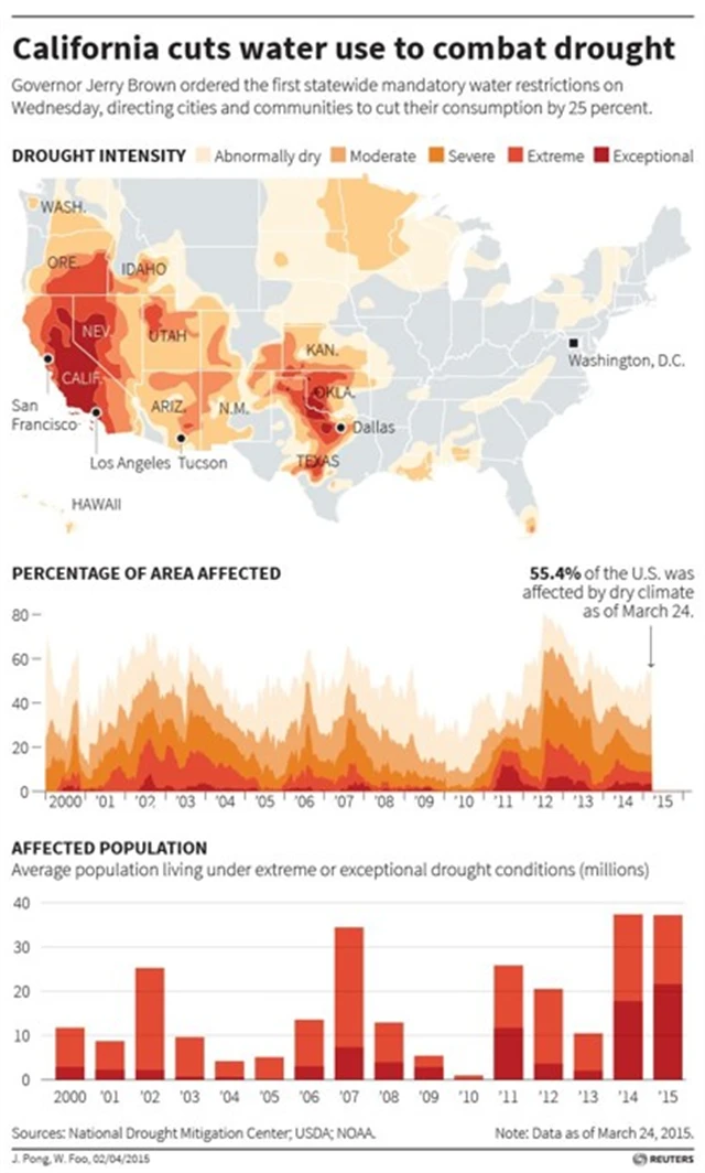 Extrémní sucho v Kalifornii je mimo jiné důsledkem nejslabší sněhové pokrývky v pohoří Sierra Nevada v dějinách měření. Spotřeba vody by se v Kalifornii podle Brownova nařízení měla snížit o čtvrtinu. Sucho ale sužuje také Nevadu, Oregon, Oklahomu, Utah, Texas, Arizonu, Kansas.