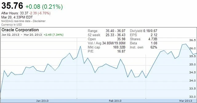 Společnost Oracle oznámila výsledky za uplynulý kvartál. Zisk byl nepatrně nižší oproti očekávání analytiků (65 centů vs. očekávaných 66 centů na akcii). Rovněž tržby překvapily negativně - analytici předpovídali 9,38 miliardy USD, firma dosáhla pouze 8,97 miliardy USD.