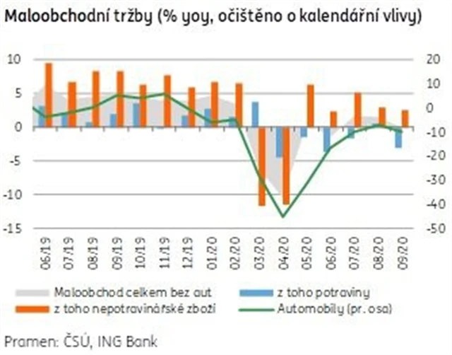 Podle složení zářijových nákupů se Češi začali připravovat na druhou vlnu krize. Zklamaly ale prodeje automobilů, které i v září zaznamenaly pokles. V dalších měsících se vzhledem k opětovnému zavedení restrikcí proti šíření koronaviru dá očekávat propad maloobchodních tržeb, podobně jako na jaře. Vyplývá to z vyjádření analytiků, které ve čtvrtek oslovila ČTK.