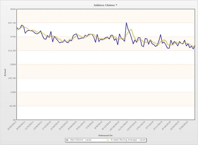 Týdenní počet nových žádostí o podporu v nezaměstnanosti ve Spojených státech vzrostl v týdnu do 17. srpna o 13 tisíc na 336 tisíc. Čekal se mírnější nárůst na 329 tisíc. Předchozí týden byl revidován výše z 320 tisíc na 323 tisíc. Čtyřtýdenní průměr klesl nejníže od listopadu 2007 na 330 500 z 332 750 (revidováno z původně hlášených 332 tisíc). Pokračující žádosti v týdnu do 10. srpna vzrostly na 2,999 milionu z 2,970 milionu v předchozím týdnu (revidováno z 2,969 milionu).