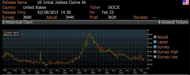 Týdenní počet žádostí o podporu v nezaměstnanosti v USA klesl oproti očekávání o 22 tisíc na 344 tisíc v týdnu končícím 23. únorem. Ekonomové očekávali 360 tisíc.
