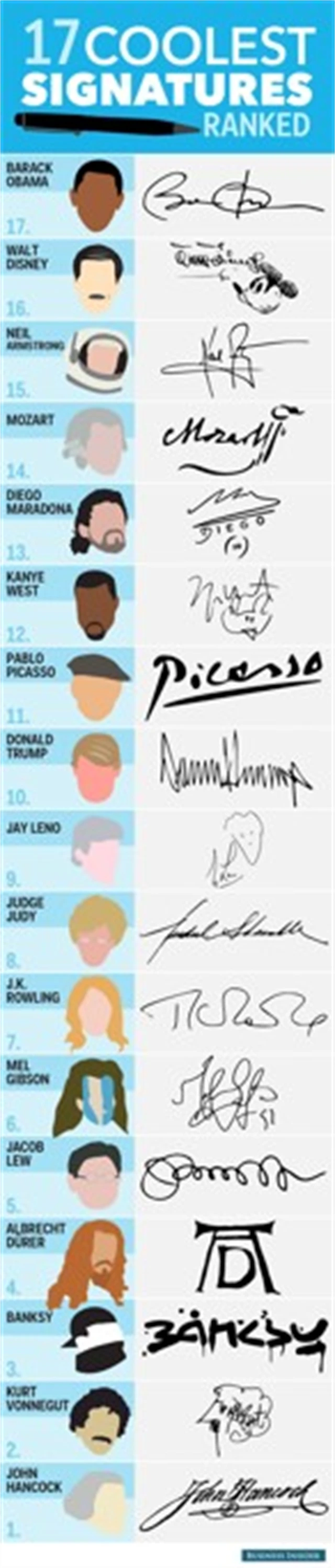 Jako děti jsme si trénovali podpisy na stránkách sešitů, jako dospělí se občas trápíme s podpisovými vzory v bance nebo na úřadech, jako sběratelé jsou někteří z nás ochotní stát dlouhou frontu před sportovním stadionem nebo u autobusu známé hudební hvězdy. Některé podpisy zaujmou svou grafickou stránkou více než ostatní. Na 17 z nich se podívejte.