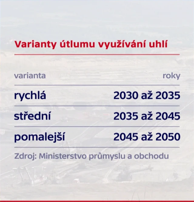 Takzvaná uhelná komise, která má řešit útlum těžby v Česku, ale také celkový energetický mix Česka včetně obnovitelných zdrojů či jádra, do září předloží tři scénáře útlumu výroby energií z uhlí. Nyní komise zveřejnila jejich časové rámce. Agresivní scénář počítá s koncem uhlí do roku 2035, konzervativní hovoří až o roku 2050.
